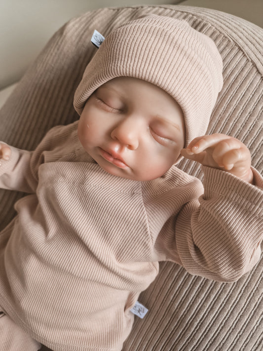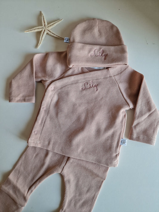 Geboorte pakje | Broekje met overslagshirt | Rib | Almond
