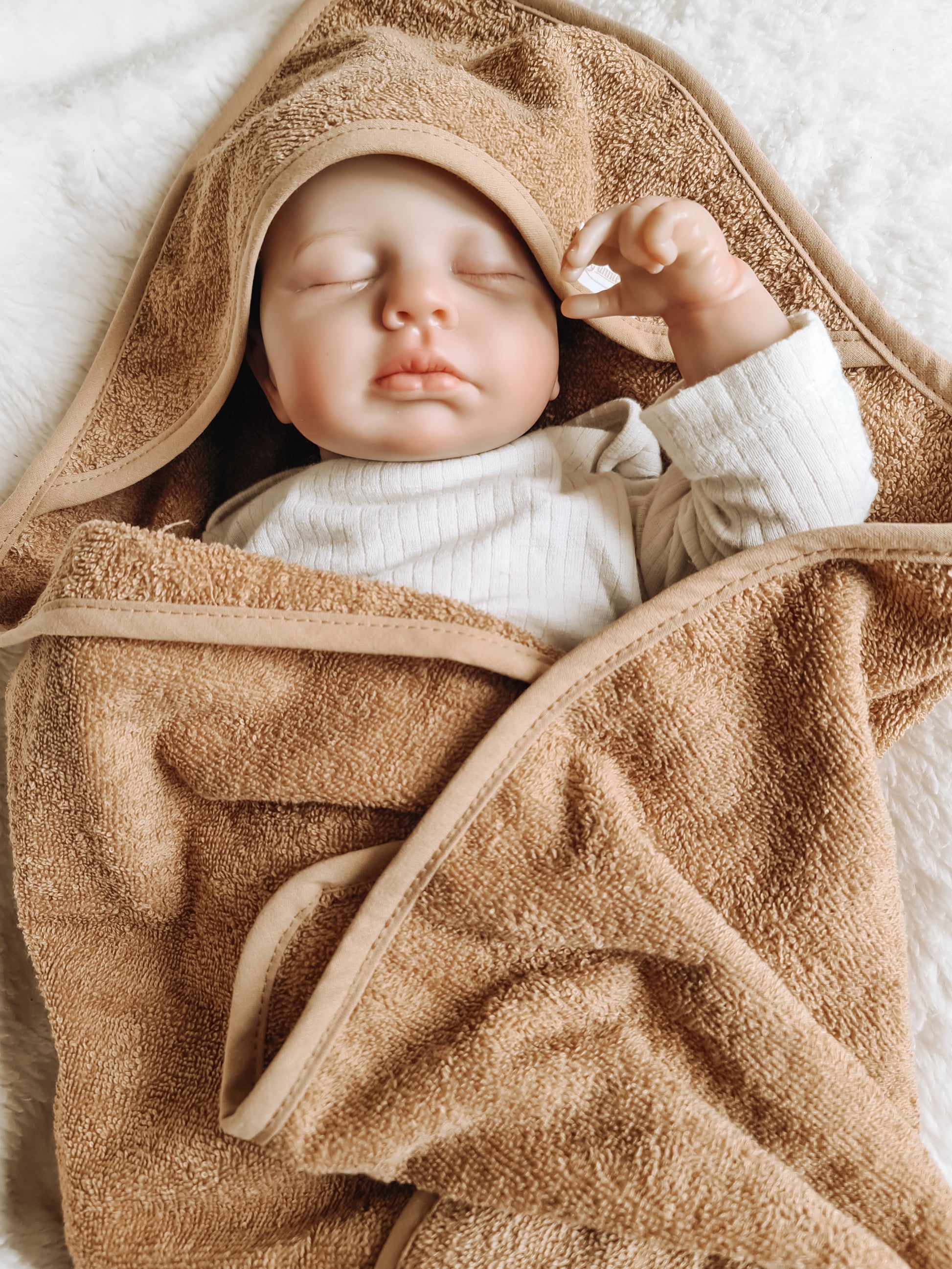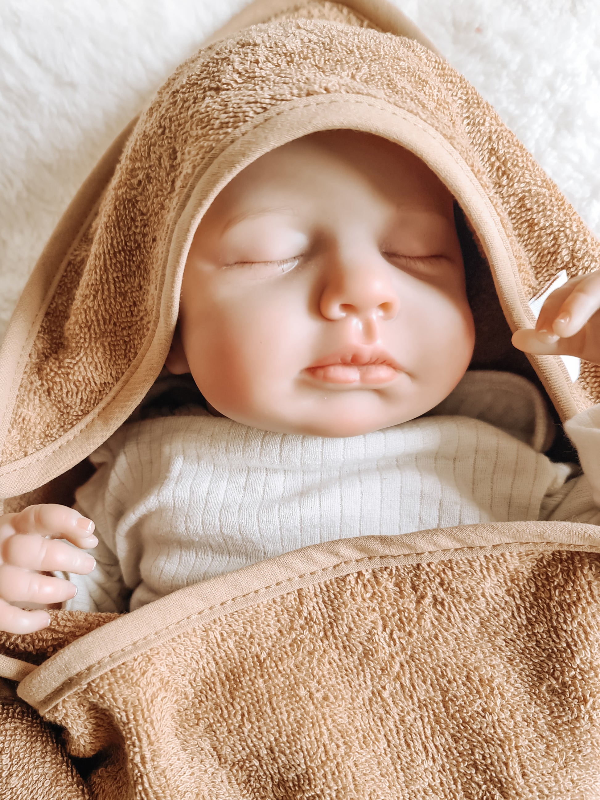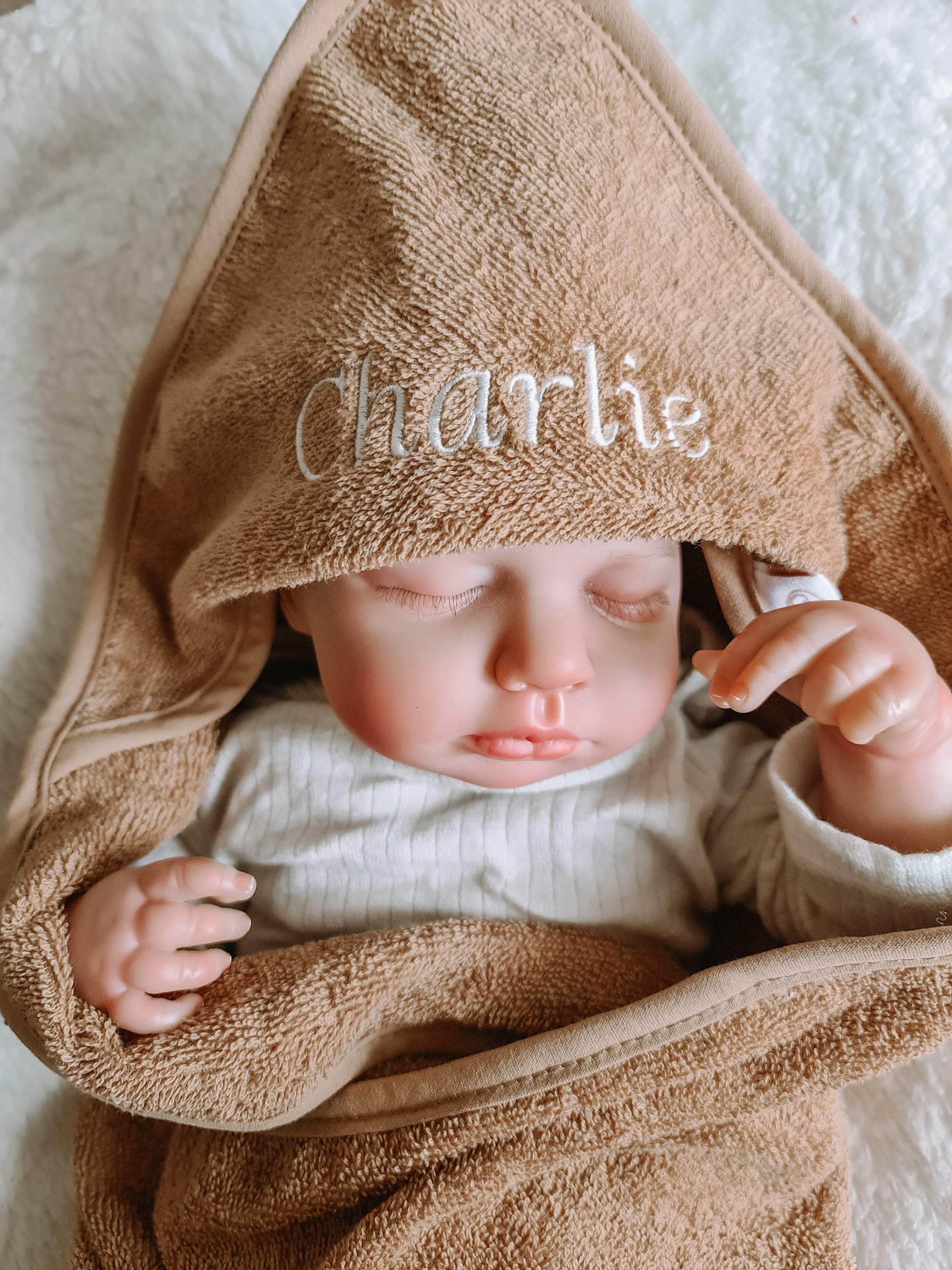 Het badritueel van je pasgeboren baby is een bijzonder moment van tederheid en verzorging. Onze zand kleurige katoenen baby badcape met naam voegt een persoonlijk tintje toe aan dit intieme moment. Het biedt het comfort van hoogwaardig katoen en een unieke personalisatie met de naam van je kleintje.