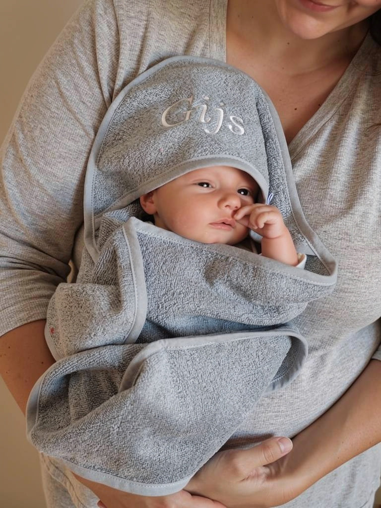 Het badritueel van je pasgeboren baby is een bijzonder moment van tederheid en verzorging. Onze blauwe katoenen baby badcape met naam voegt een persoonlijk tintje toe aan dit intieme moment. Het biedt het comfort van hoogwaardig katoen en een unieke personalisatie met de naam van je kleintje.