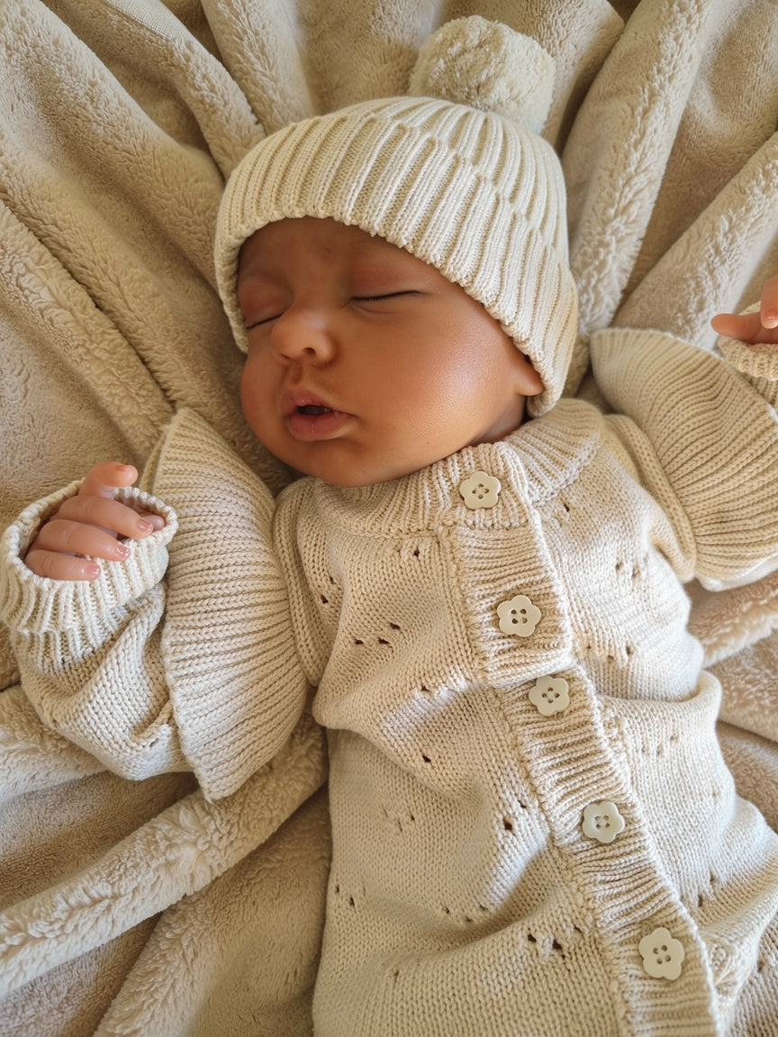 Completeer de look met een bijpassend gebreid mutsje in dezelfde zachte Casmere kleur. Zo creëer je een harmonieus setje voor je baby.