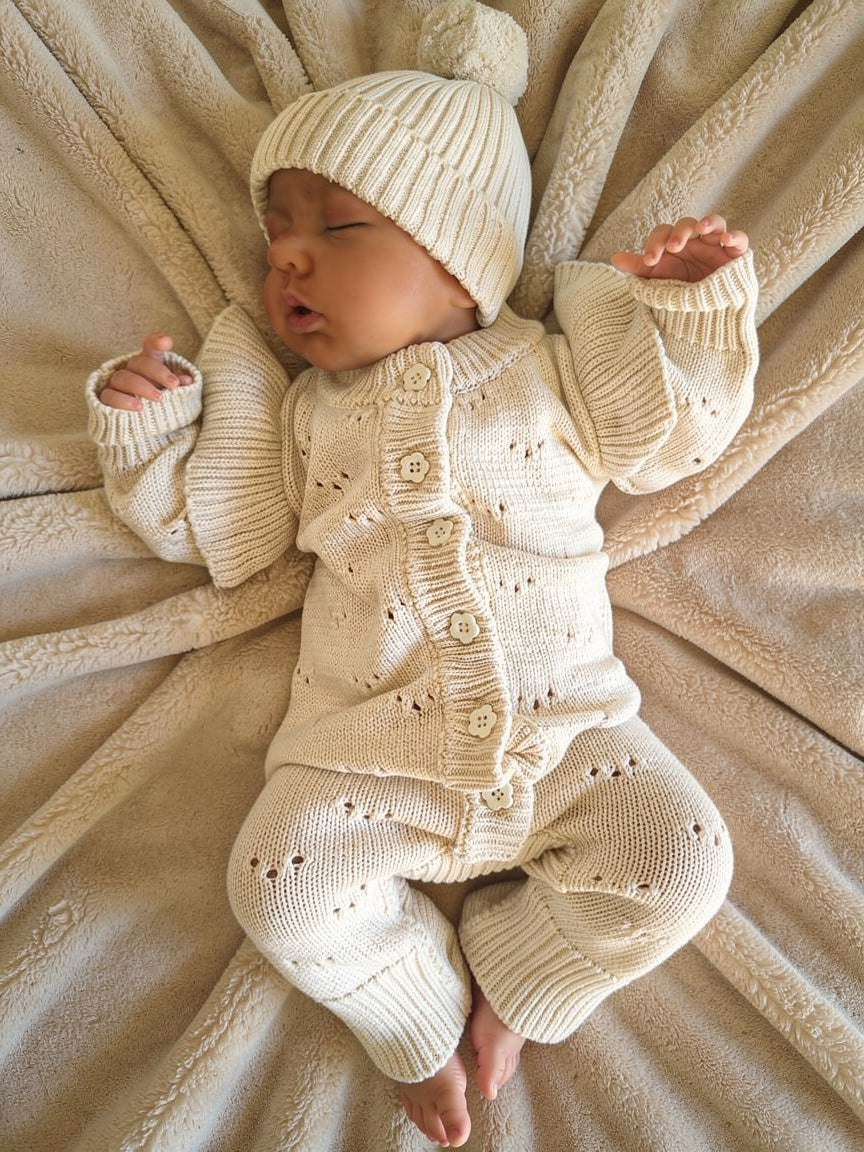 Dit betoverende gebreide boxpakje Luna in de zachte Casmere kleur is een dromerig kledingstuk voor je baby. Het pakje is volledig gebreid van 100% biologisch katoen en versierd met lieve bloemetjesknoopjes en een speelse ruffle op de schouder.