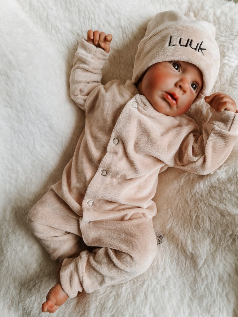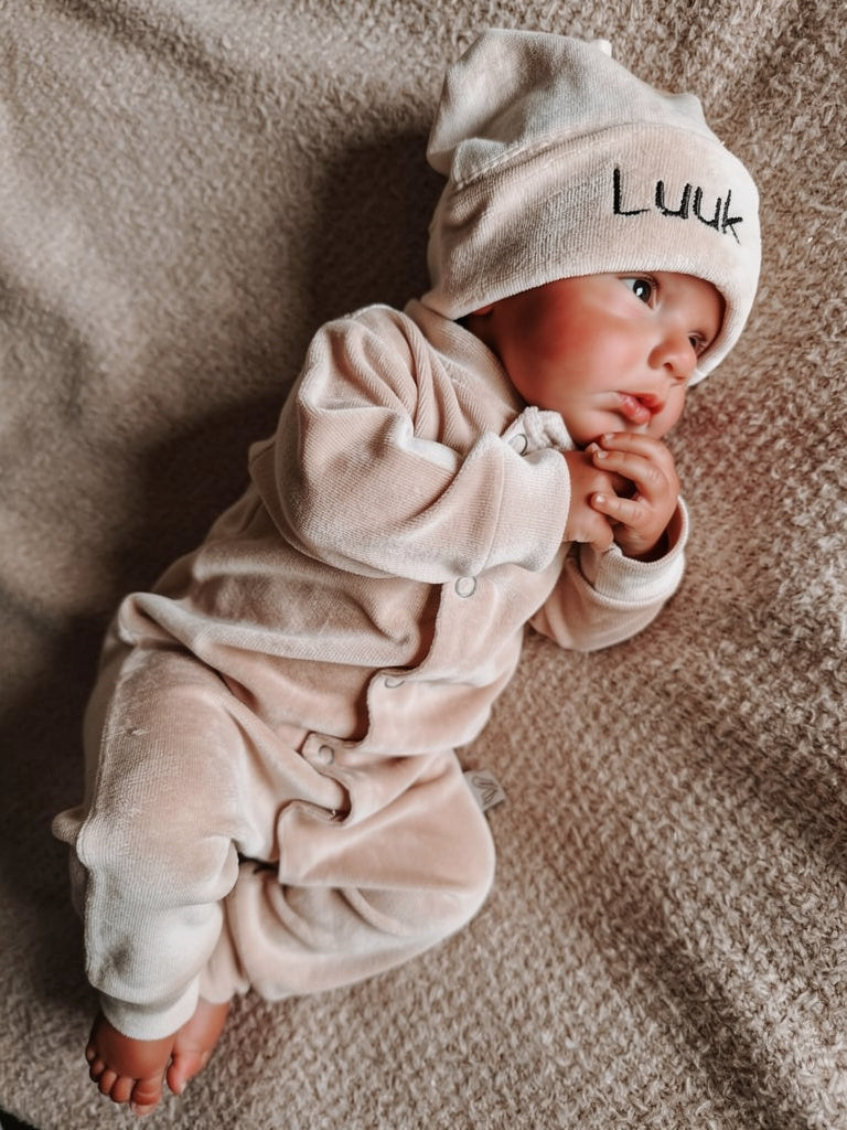 Dit boxpakje kun je helemaal afmaken met een babymutsje. Wil je liever niet het boxpakje personaliseren met naam, dan kun je er voor kiezen om het mutsje te personaliseren met de naam van je kindje.
