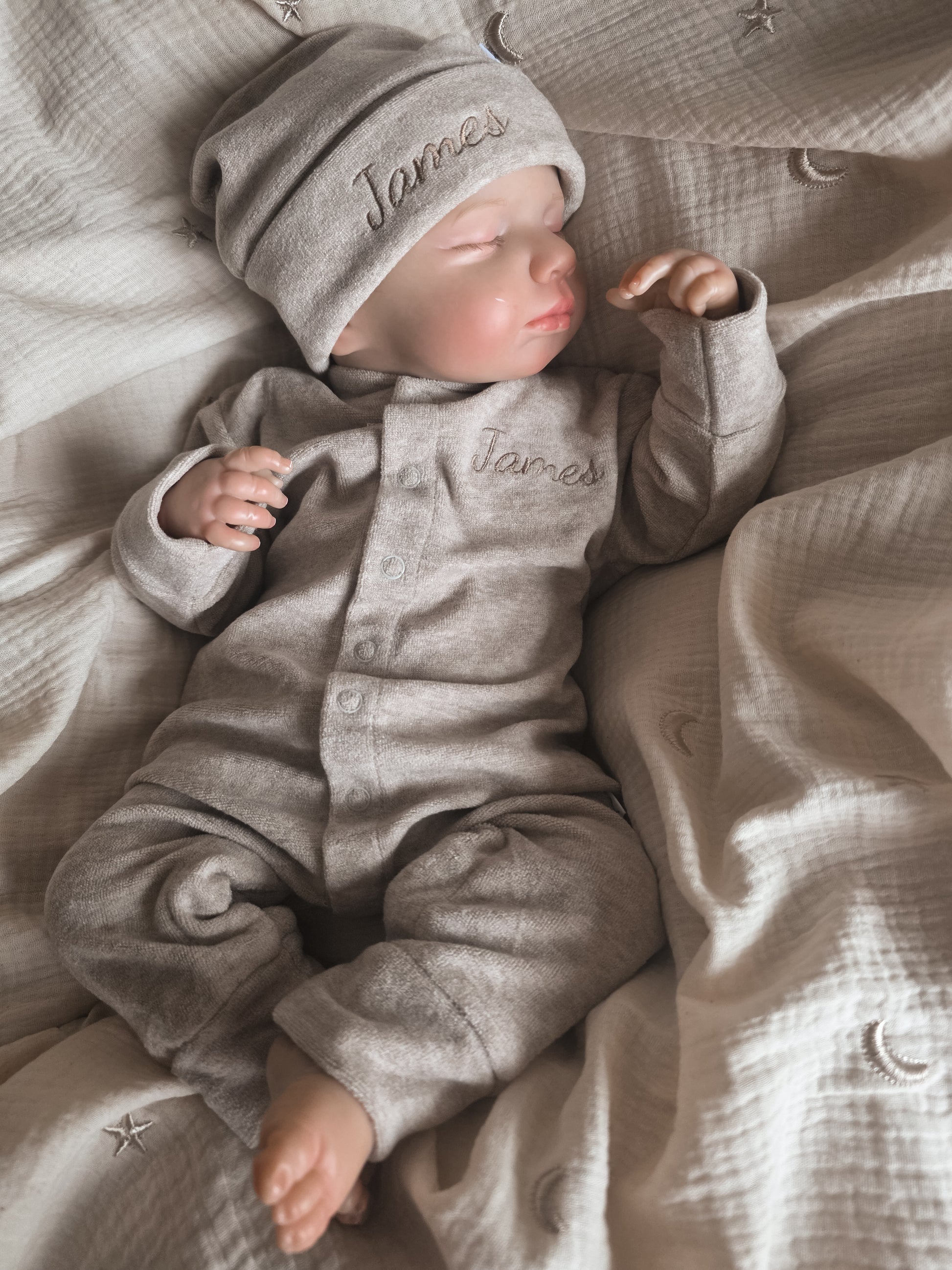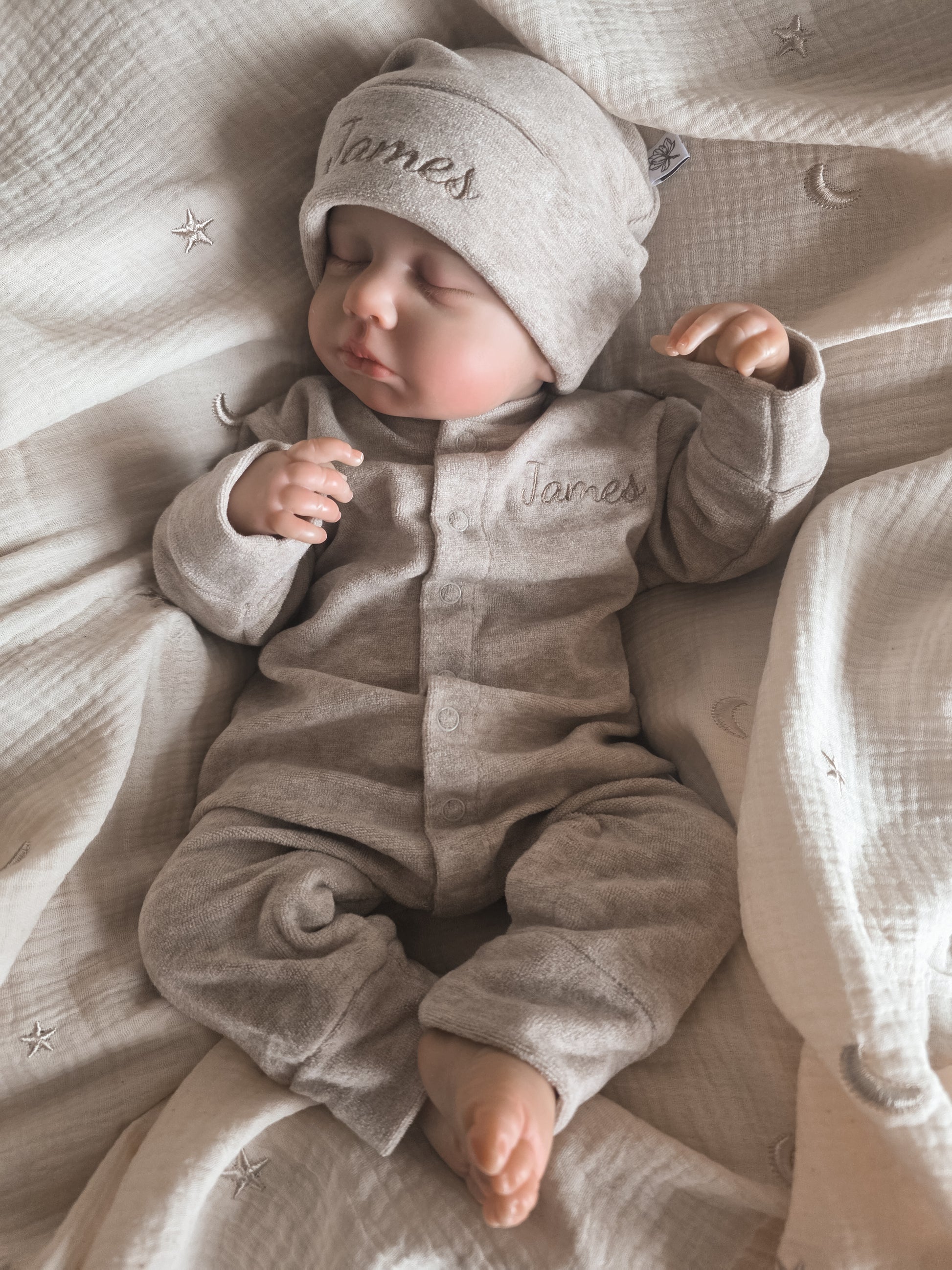 Dit prachtige boxpakje in een warme licht beige-grijze kleur is gemaakt van het zachtste materiaal dat je je kunt voorstellen. De teddy-zachte stof voelt als een warme knuffel tegen de gevoelige babyhuid.