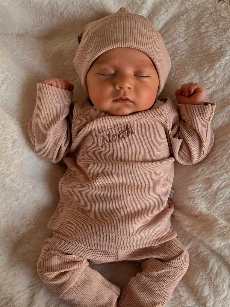 Ons geboortepakje met naam is een bijzonder en uniek cadeau voor jezelf of als kraamcadeau. De zachte rib stof zorgt ervoor dat het pakje heerlijk aanvoelt op de tere babyhuid en geeft jouw kleintje direct een warme en stijlvolle uitstraling. De kleur almond is neutraal, tijdloos en past bij elke gelegenheid.