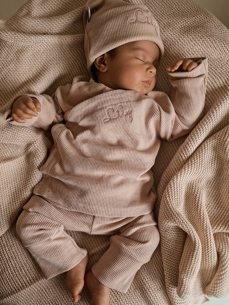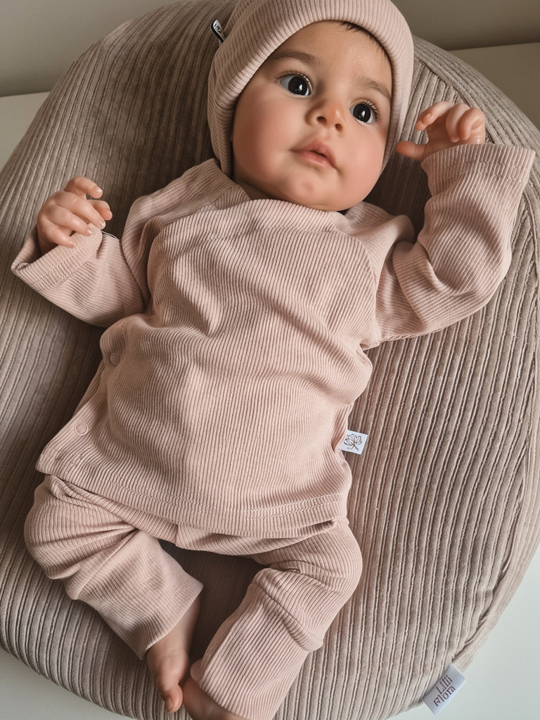 Op zoek naar het perfecte geboortepakje voor jouw pasgeboren kindje? Bij Lilii Flora hebben we een prachtige geboorteset bestaande uit een broekje met een overslagshirtje in een zachte rib stof, verkrijgbaar in de kleur almond. Deze set is niet alleen stijlvol en comfortabel, maar je kunt het ook personaliseren met de naam van je baby!