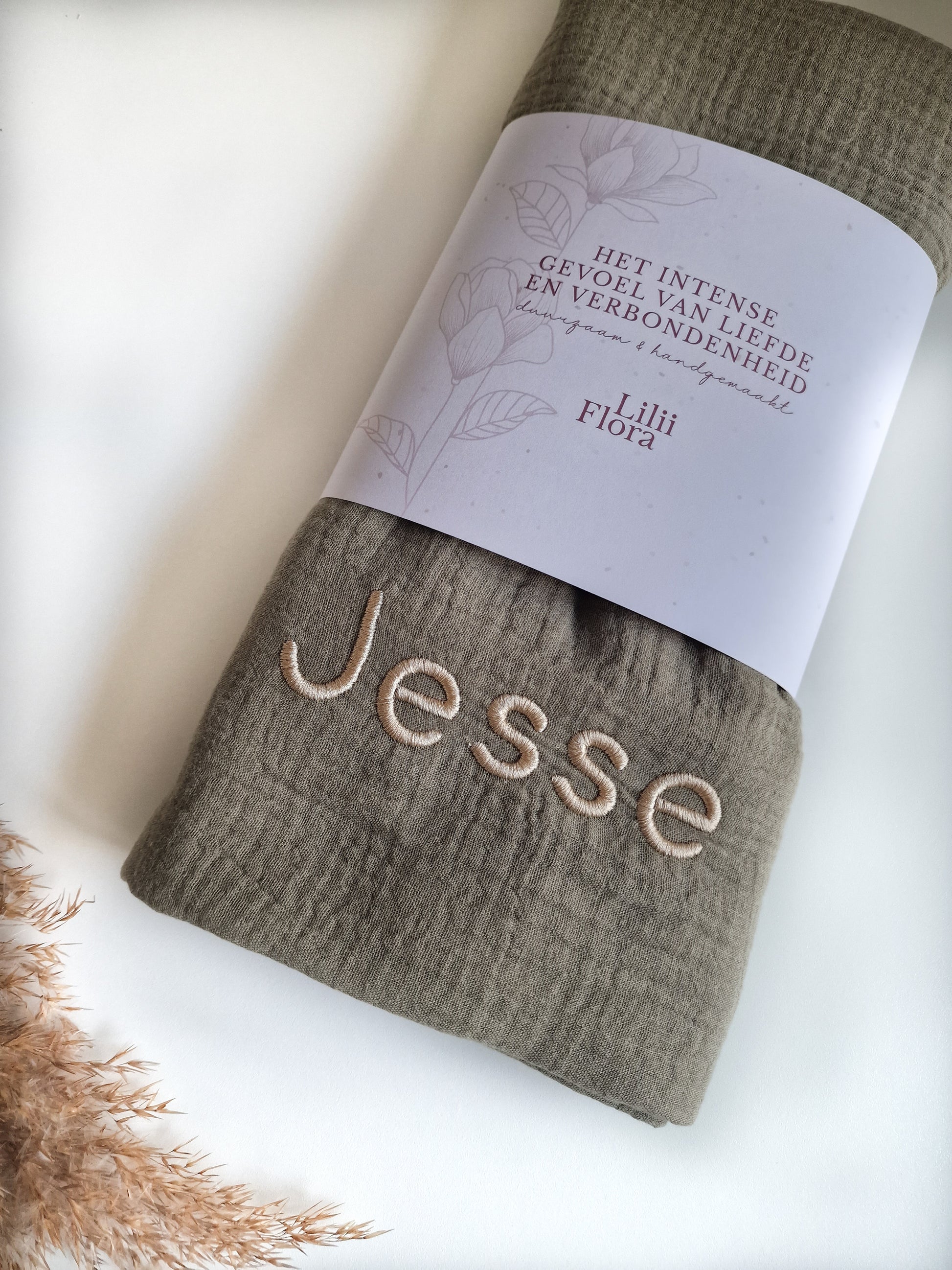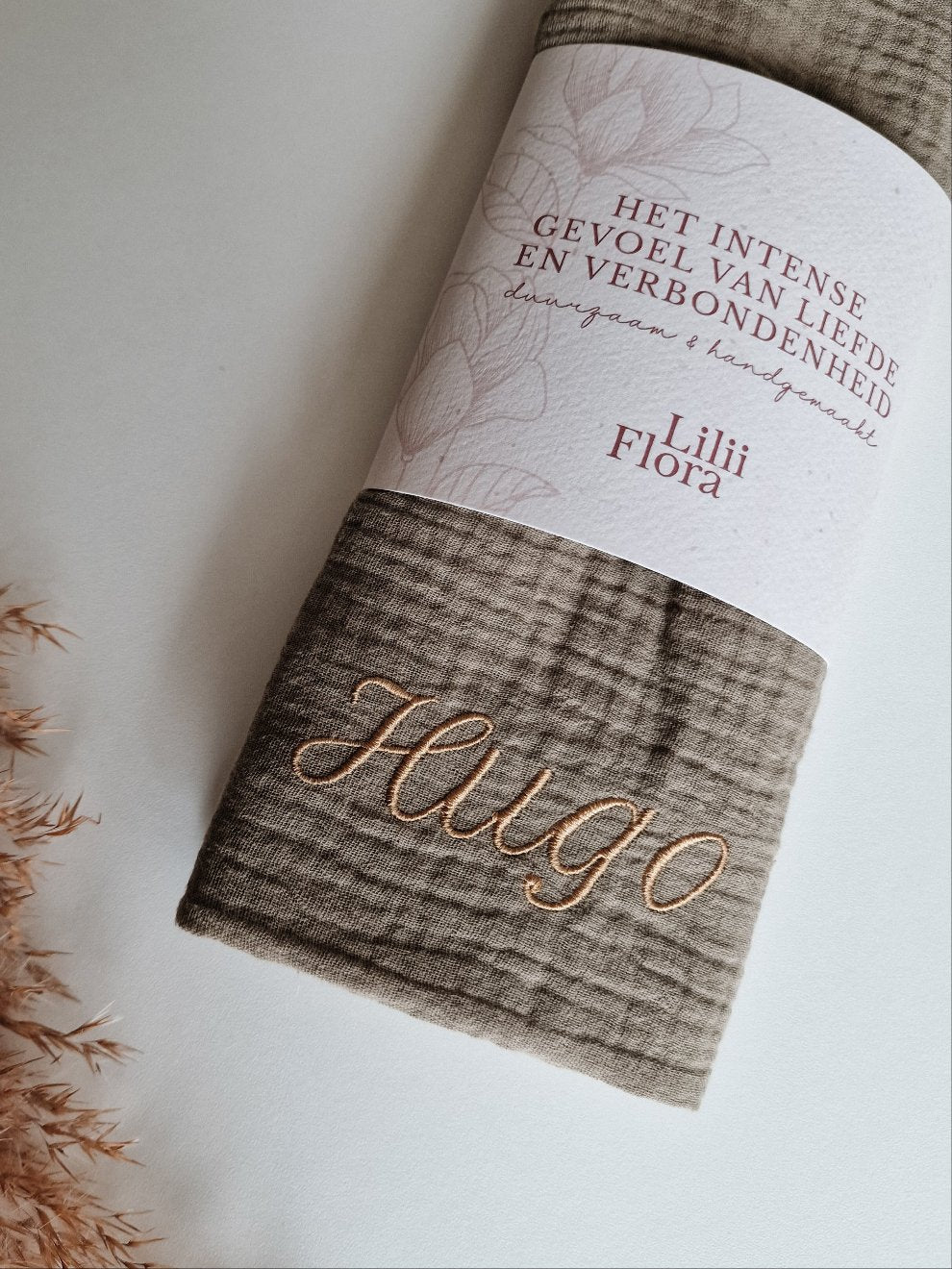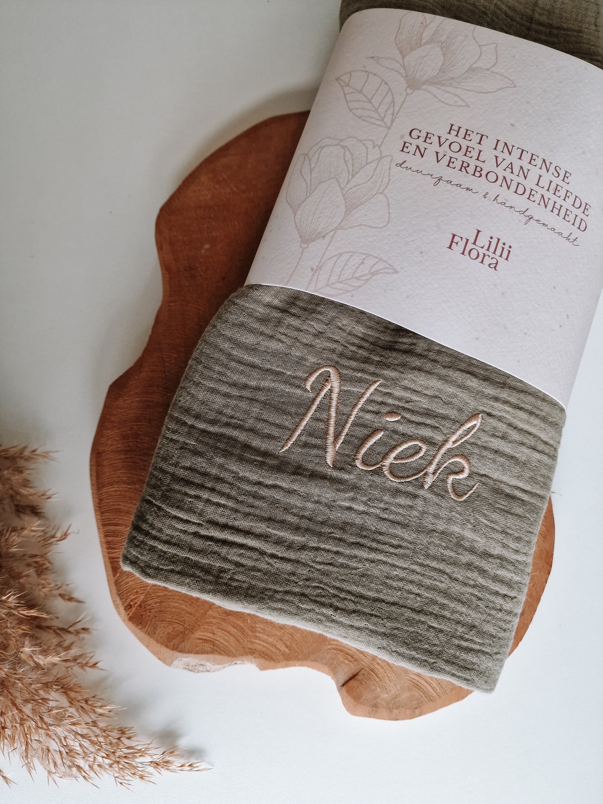 Door het ideale formaat van deze hydrofiele doek met naam is deze perfect te gebruiken als inbakerdoek. De stof is dun en luchtdoorlatend en mega zacht. Je kan je kindje gemakkelijk inbakeren zodat je een geborgen plekje kan bieden. Je kindje zal rustig kunnen slapen in deze inbakerdoek.